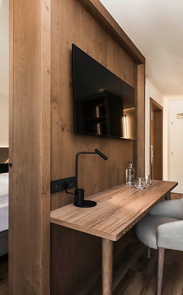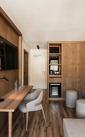 Dank des heimischen Holzes und der gemütlichen Sitzecke verleihen diesen Zimmern besonderen Komfort.