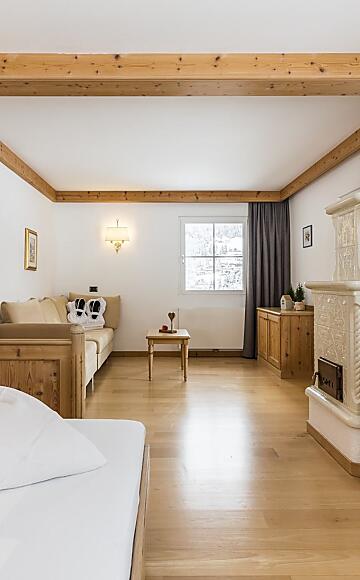 - a cozy sitting area with spruce wood panelling with a tiled stove for that real mountain feeling