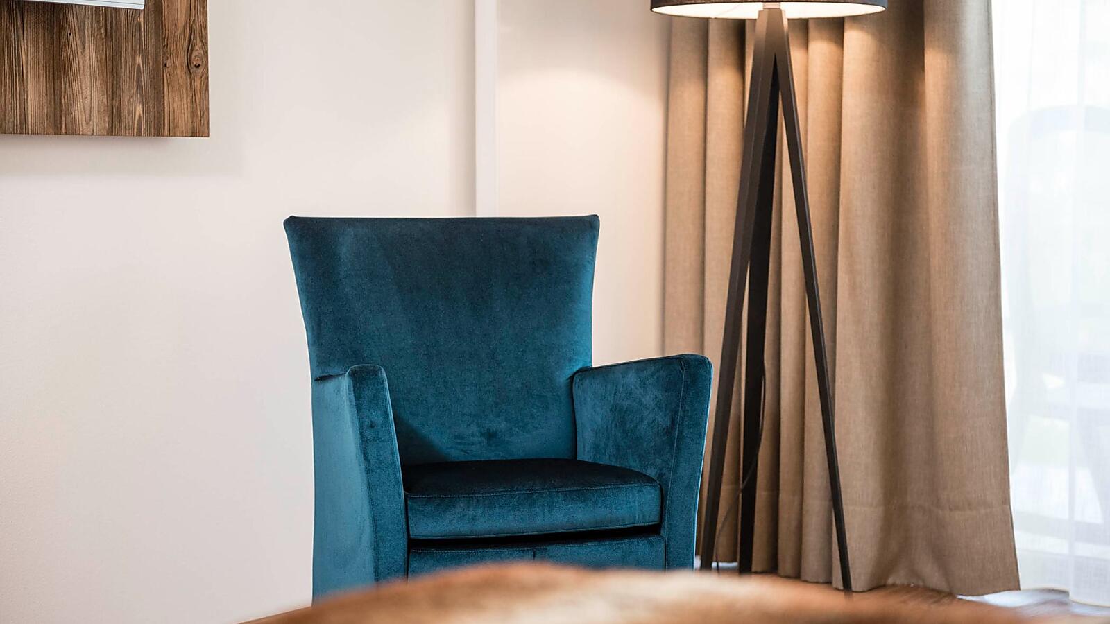 Thanks to the warm wood and the cozy sitting corner, these rooms offer refined comfort.