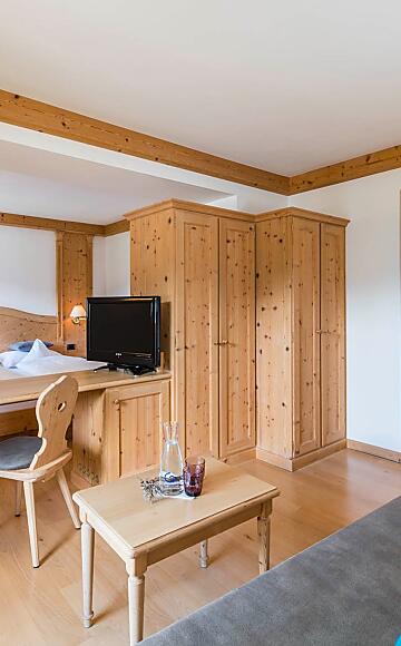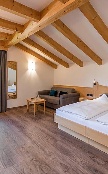 Grazie al caldo legno e all'accogliente angolino soggiorno, queste camere offrono un comfort raffinato.