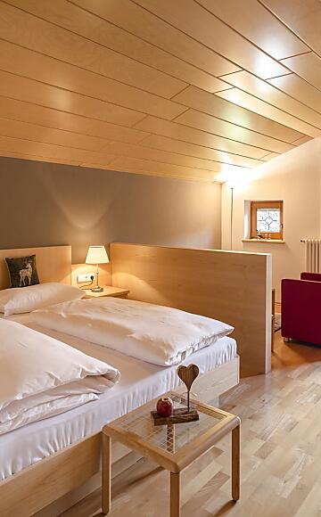 Grazie al caldo legno e all'accogliente angolino soggiorno, queste camere offrono un comfort raffinato.