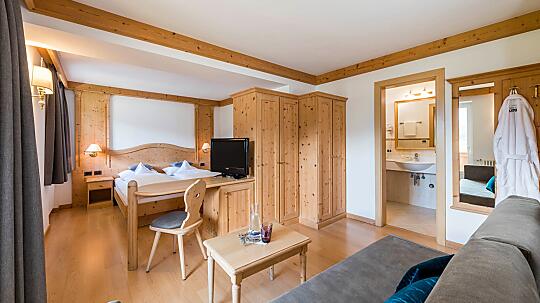 Grazie al caldo legno e all'accogliente angolino soggiorno, queste camere offrono un comfort raffinato.