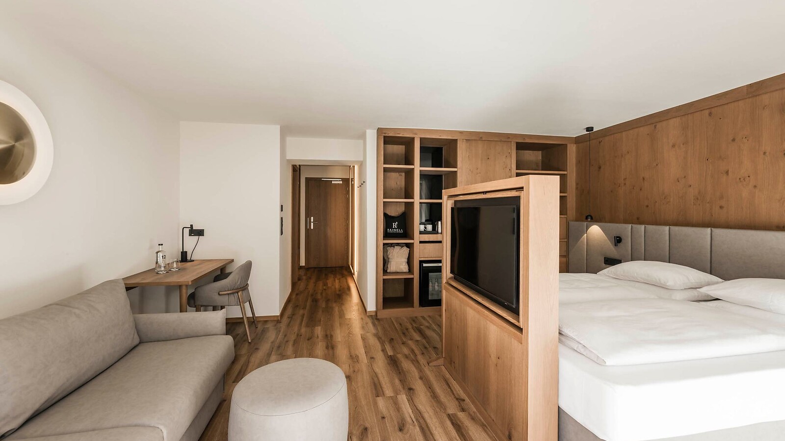 Grazie al caldo legno e all'accogliente angolino soggiorno, queste camere offrono un comfort raffinato.